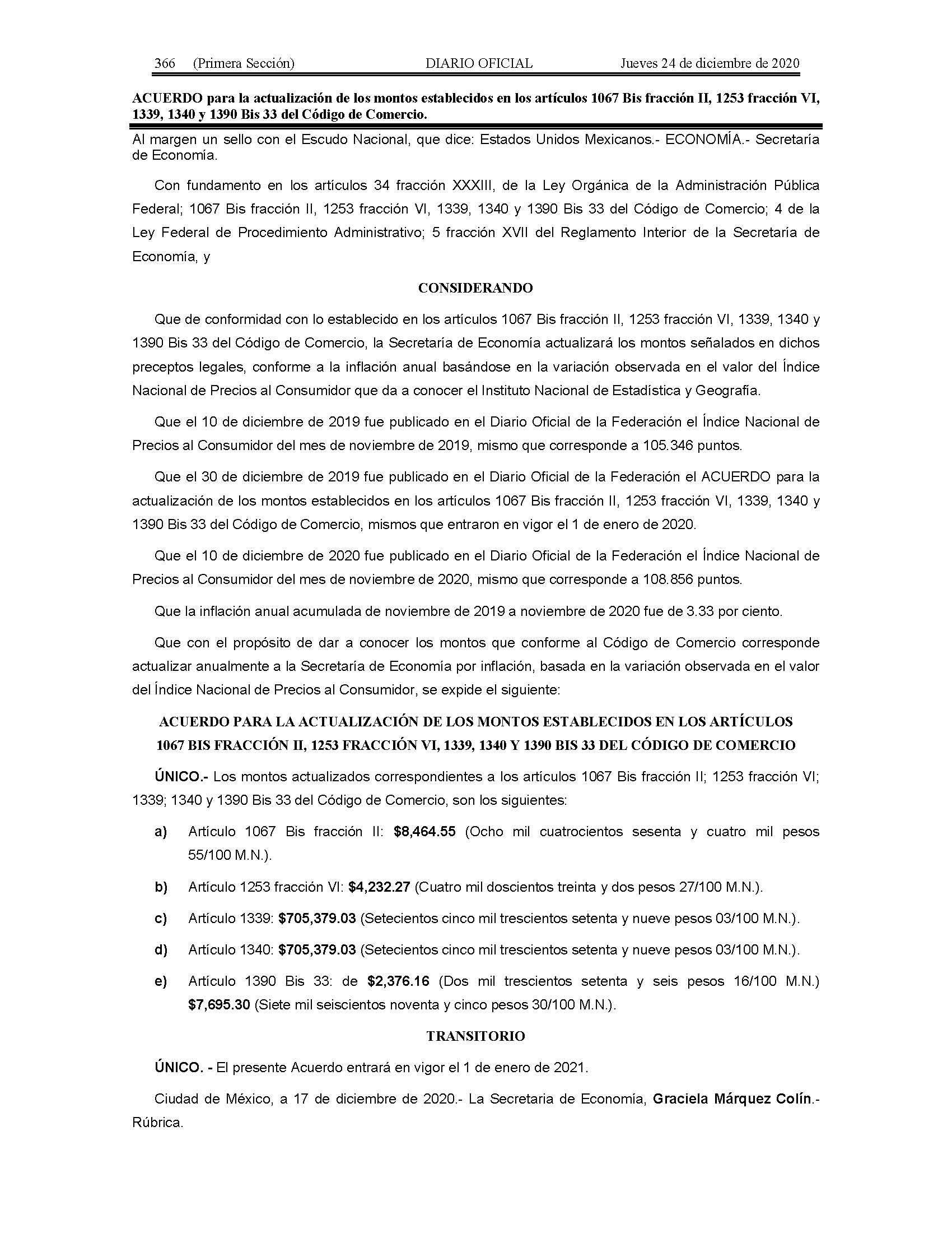 Acuerdo para la actualización de los montos establecidos en los artículos 1067 Bis fracción II, 1253 fracción VI, 1339, 1340 y 1390 Bis 33 del Código de Comercio.