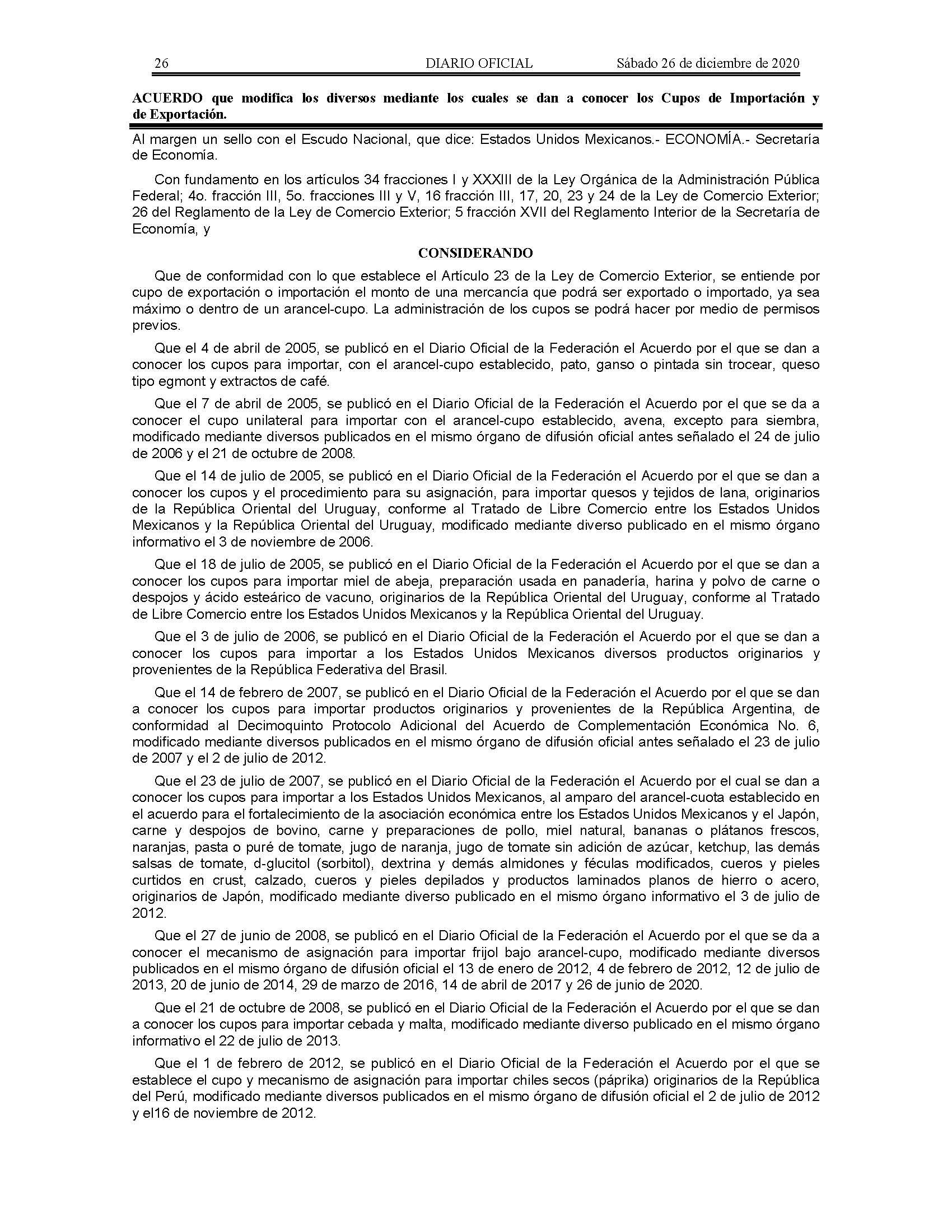 Acuerdo que modifica los diversos mediante los cuales se dan a conocer los Cupos de Importación y de Exportación.