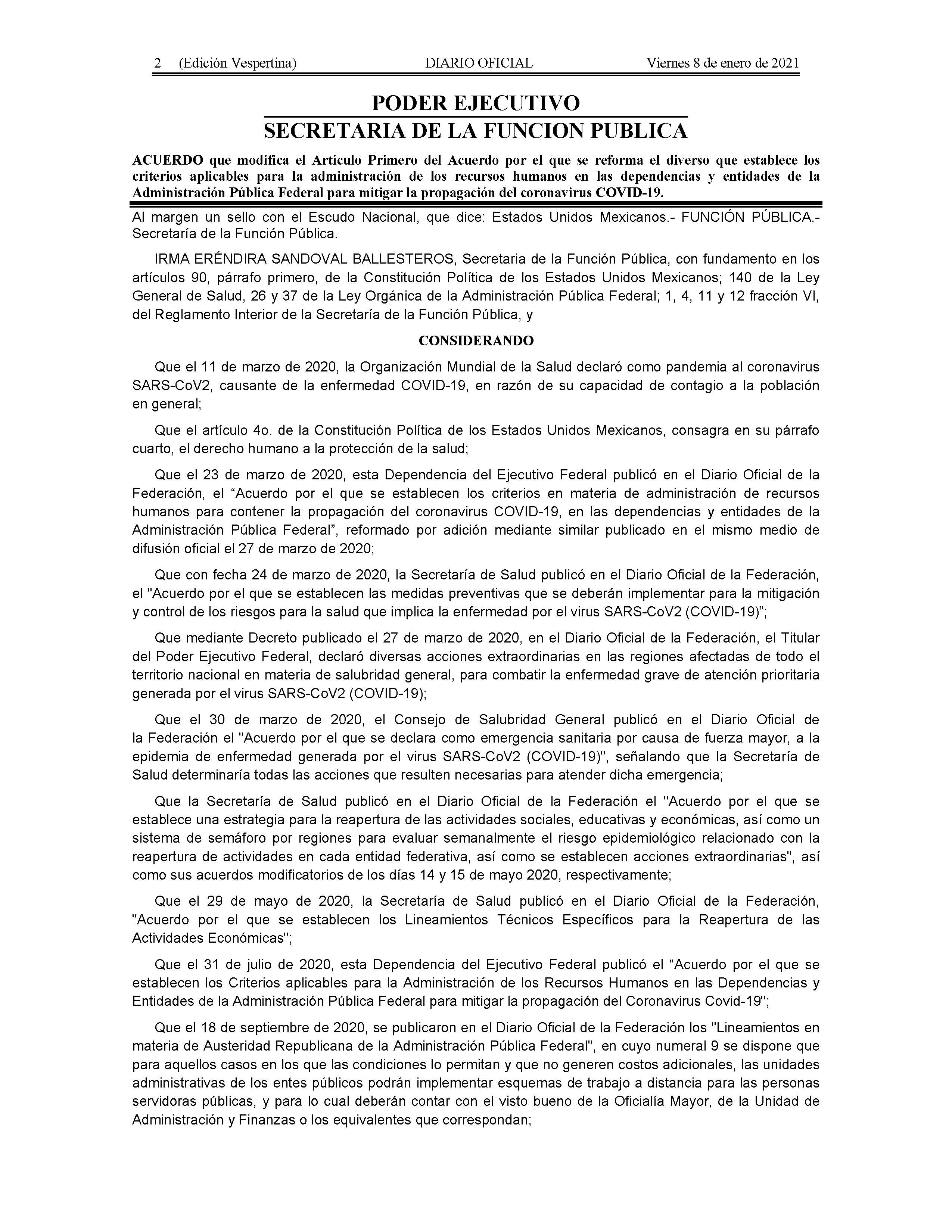 Acuerdo que modifica el Artículo Primero del Acuerdo por el que se reforma el diverso que establece los criterios aplicables para la administración de los recursos humanos en las dependencias y entidades de la Administración Pública Federal para mitigar la propagación del coronavirus COVID-19.