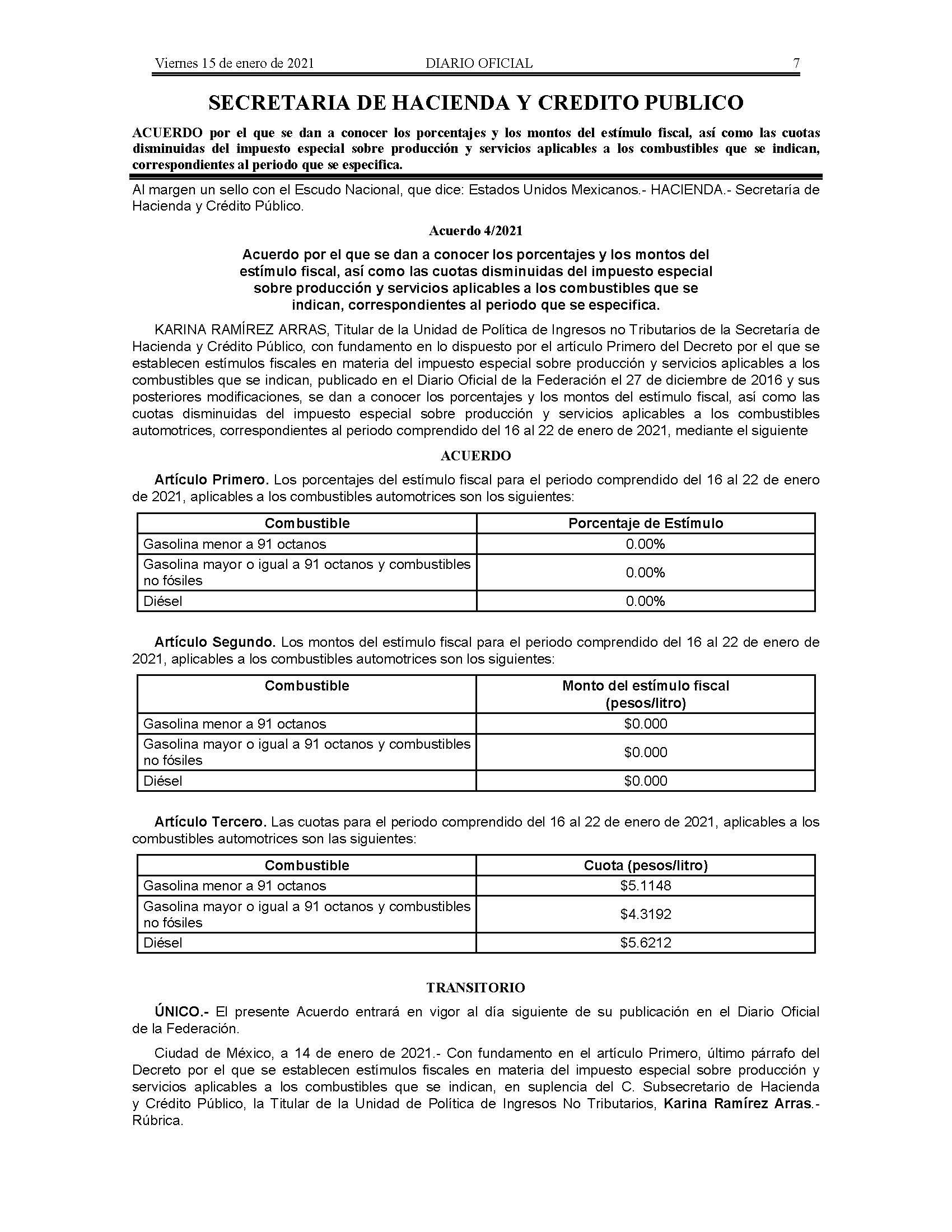 Acuerdo por el que se dan a conocer los porcentajes y los montos del estímulo fiscal, así como las cuotas disminuidas del impuesto especial sobre producción y servicios aplicables a los combustibles que se indican, correspondientes al periodo que se especifica.