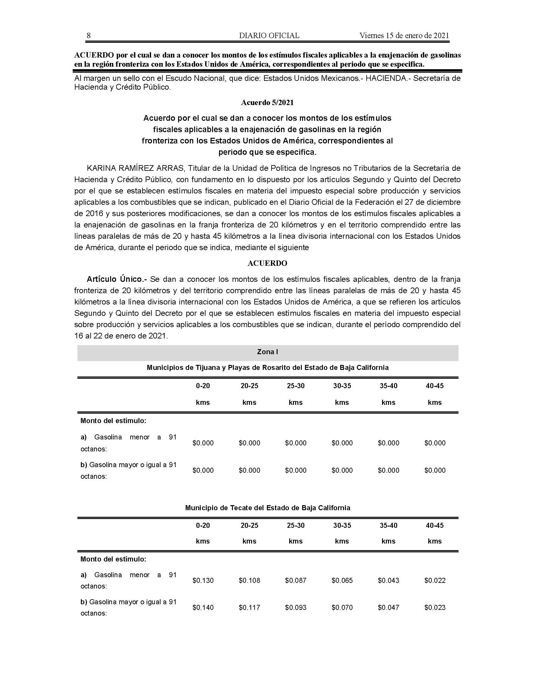 Acuerdo por el cual se dan a conocer los montos de los estímulos fiscales aplicables a la enajenación de gasolinas en la región fronteriza con los Estados Unidos de América, correspondientes al periodo que se especifica.