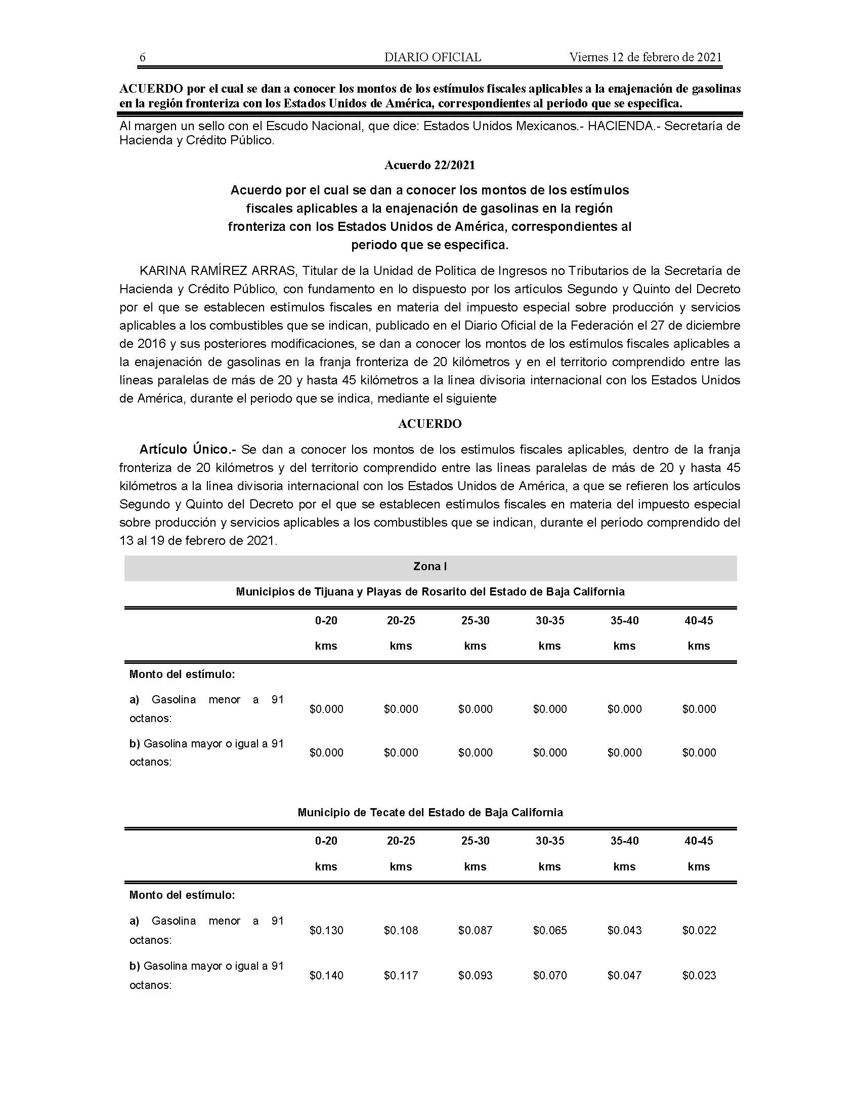 Acuerdo por el cual se dan a conocer los montos de los estímulos fiscales aplicables a la enajenación de gasolinas en la región fronteriza con los Estados Unidos de América, correspondientes al periodo que se especifica.