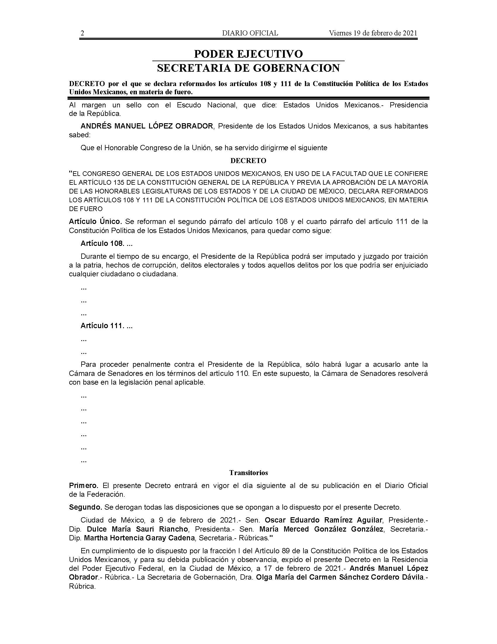 Decreto por el que se declara reformados los artículos 108 y 111 de la Constitución Política de los Estados Unidos Mexicanos, en materia de fuero.