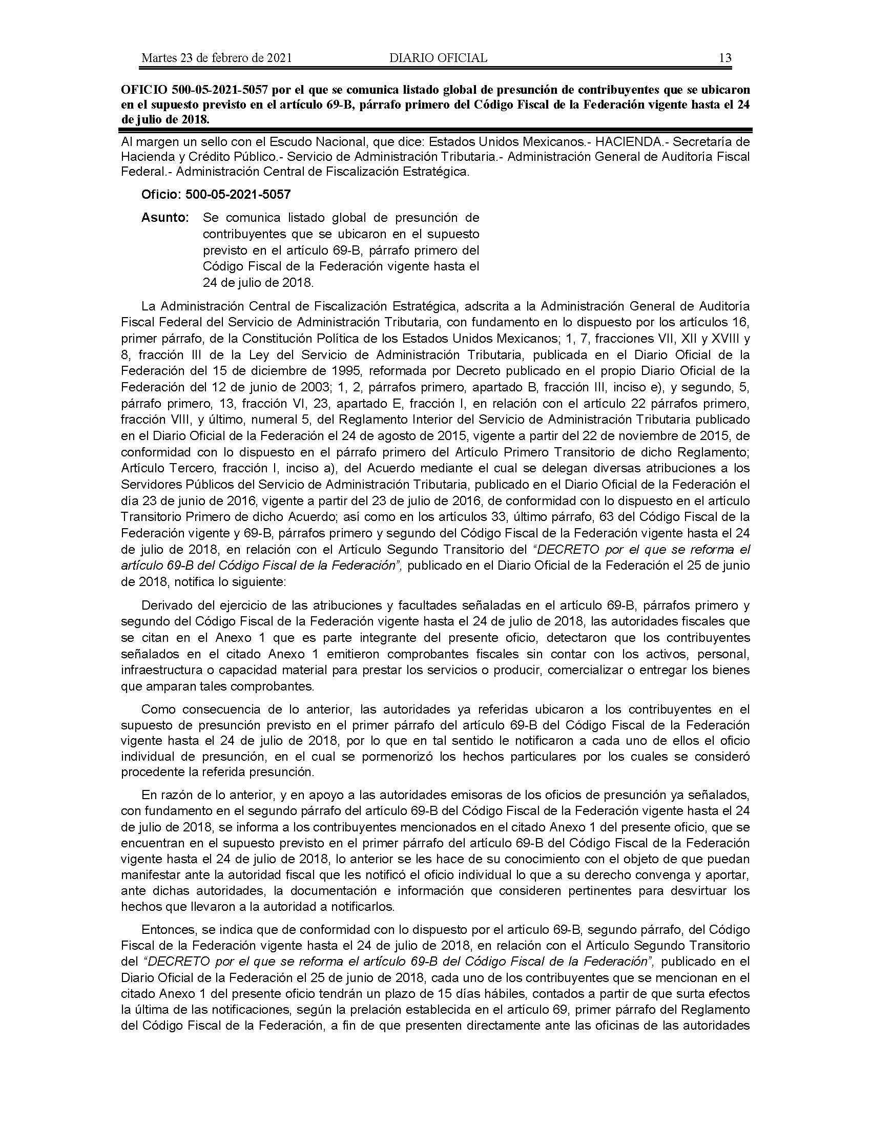 Oficio 500-05-2021-5057 por el que se comunica listado global de presunción de contribuyentes que se ubicaron en el supuesto previsto en el artículo 69-B, párrafo primero del Código Fiscal de la Federación vigente hasta el 24 de julio de 2018.