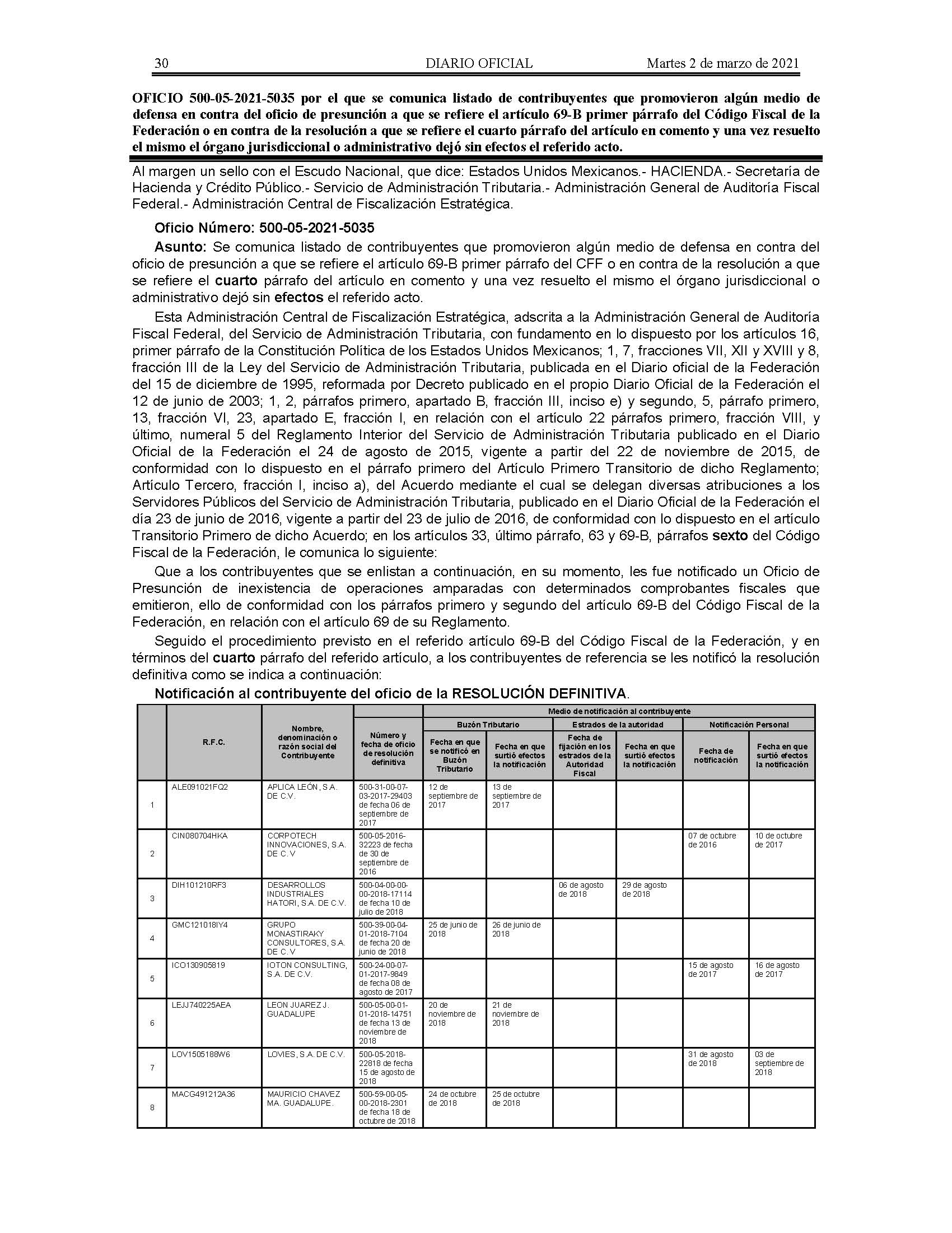 Oficio 500-05-2021-5035 por el que se comunica listado de contribuyentes que promovieron algún medio de defensa en contra del oficio de presunción a que se refiere el artículo 69-B primer párrafo del Código Fiscal de la Federación o en contra de la resolución a que se refiere el cuarto párrafo del artículo en comento y una vez resuelto el mismo el órgano jurisdiccional o administrativo dejó sin efectos el referido acto.