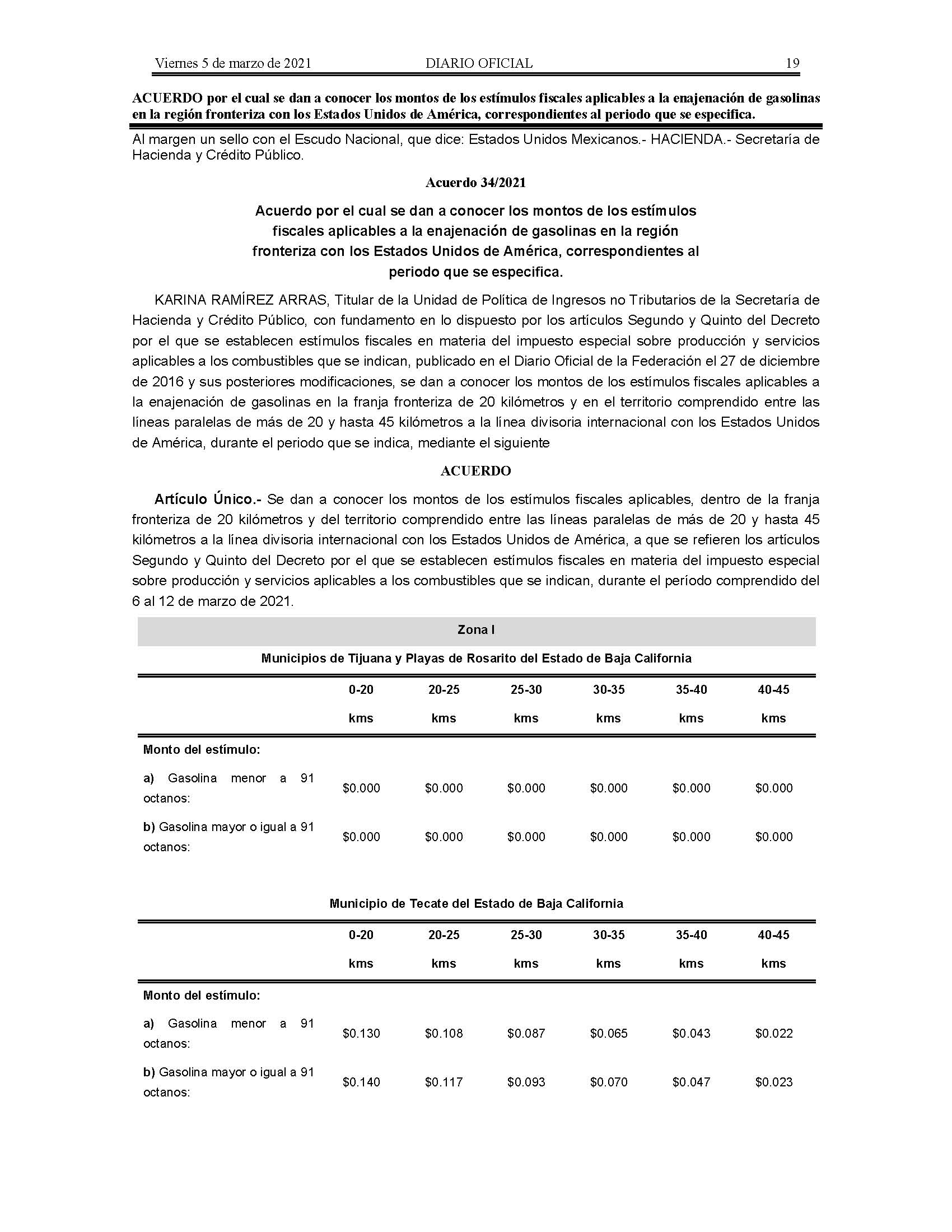 Acuerdo por el cual se dan a conocer los montos de los estímulos fiscales aplicables a la enajenación de gasolinas en la región fronteriza con los Estados Unidos de América, correspondientes al periodo que se especifica.