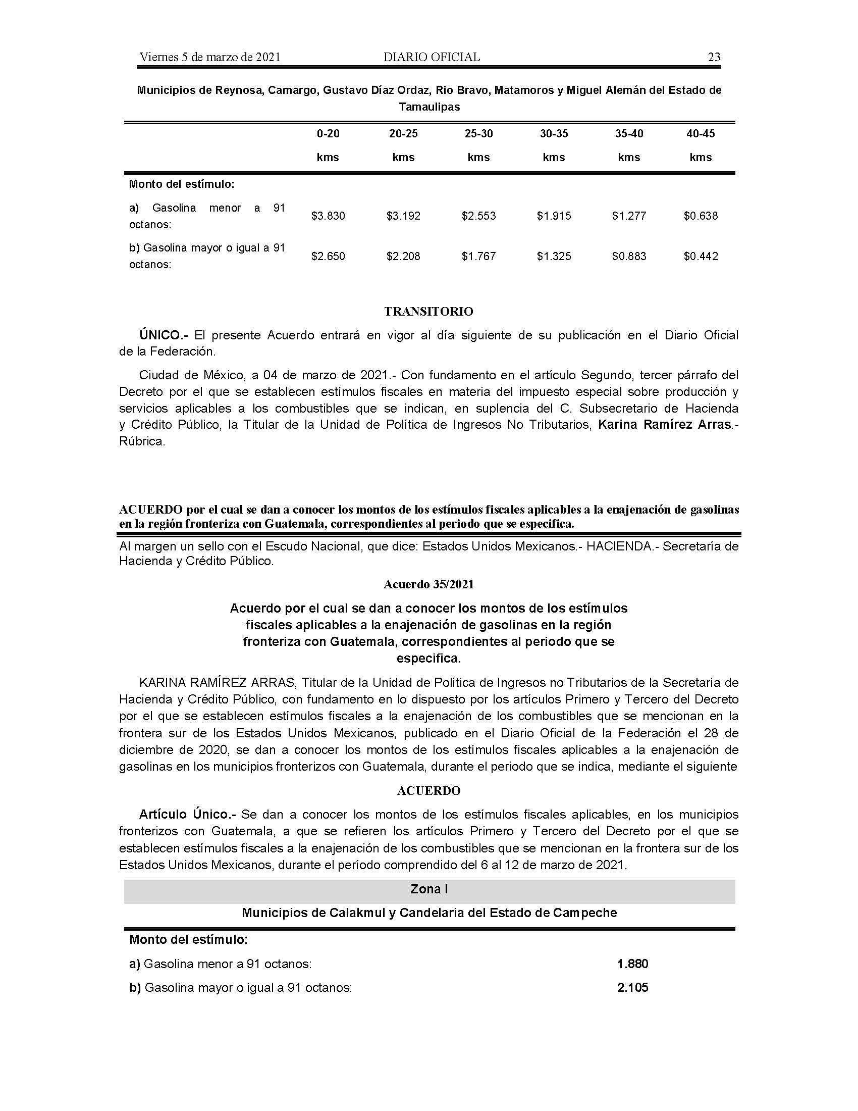 Acuerdo por el cual se dan a conocer los montos de los estímulos fiscales aplicables a la enajenación de gasolinas en la región fronteriza con Guatemala, correspondientes al periodo que se especifica.