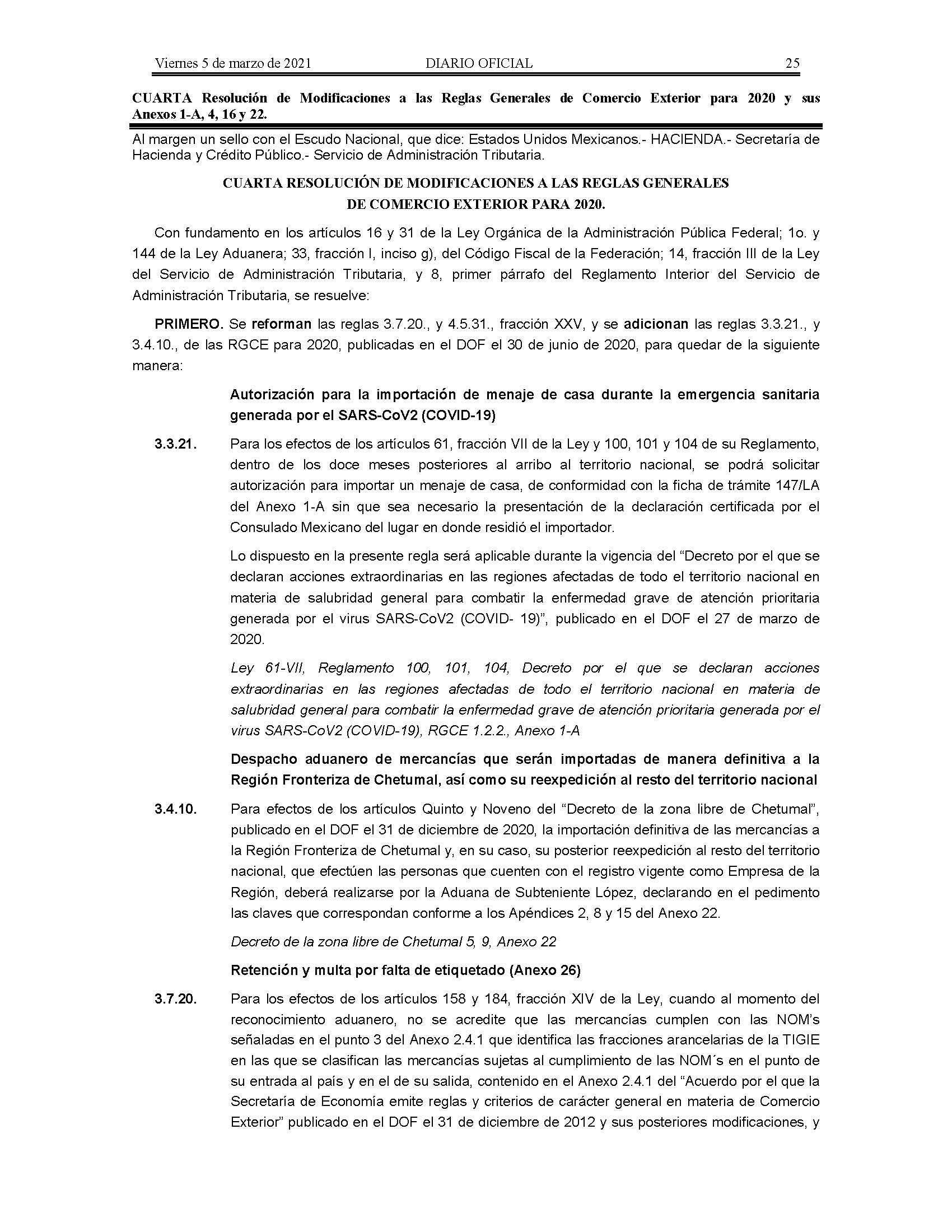Cuarta Resolución de Modificaciones a las Reglas Generales de Comercio Exterior para 2020 y sus Anexos 1-A, 4, 16 y 22.