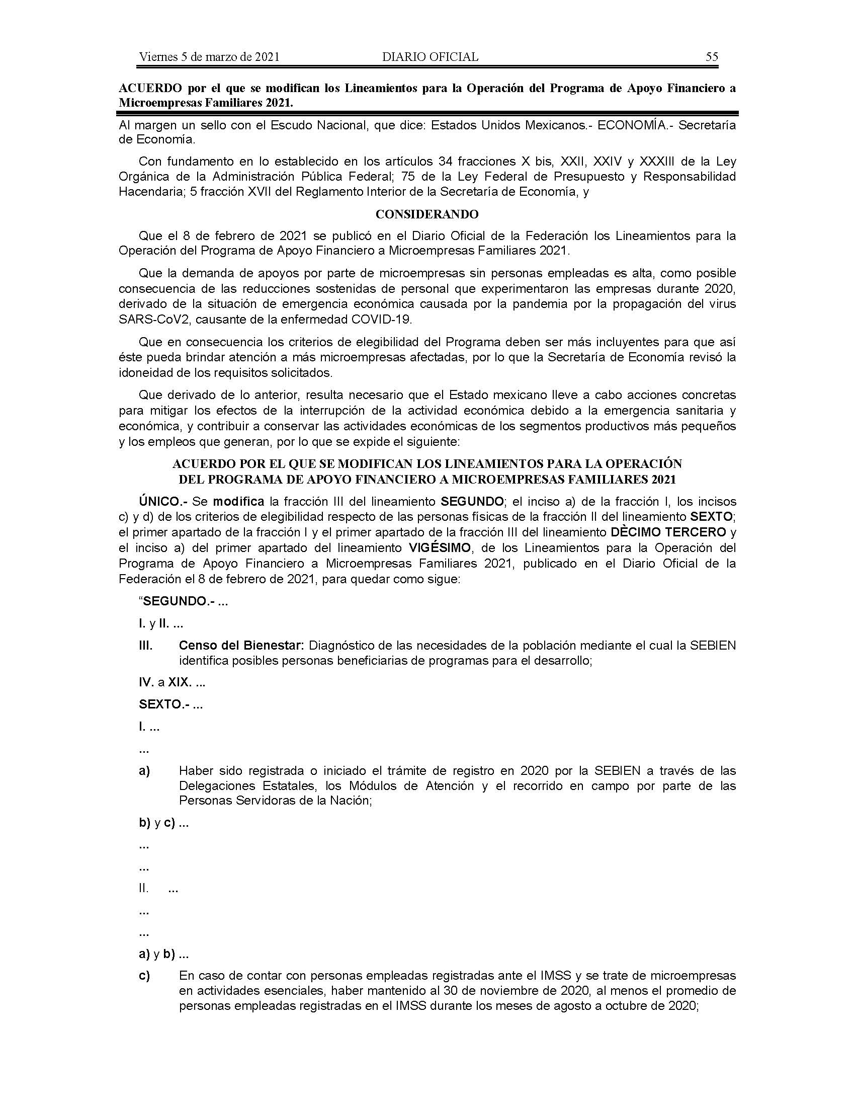 Acuerdo por el que se modifican los Lineamientos para la Operación del Programa de Apoyo Financiero a Microempresas Familiares 2021.