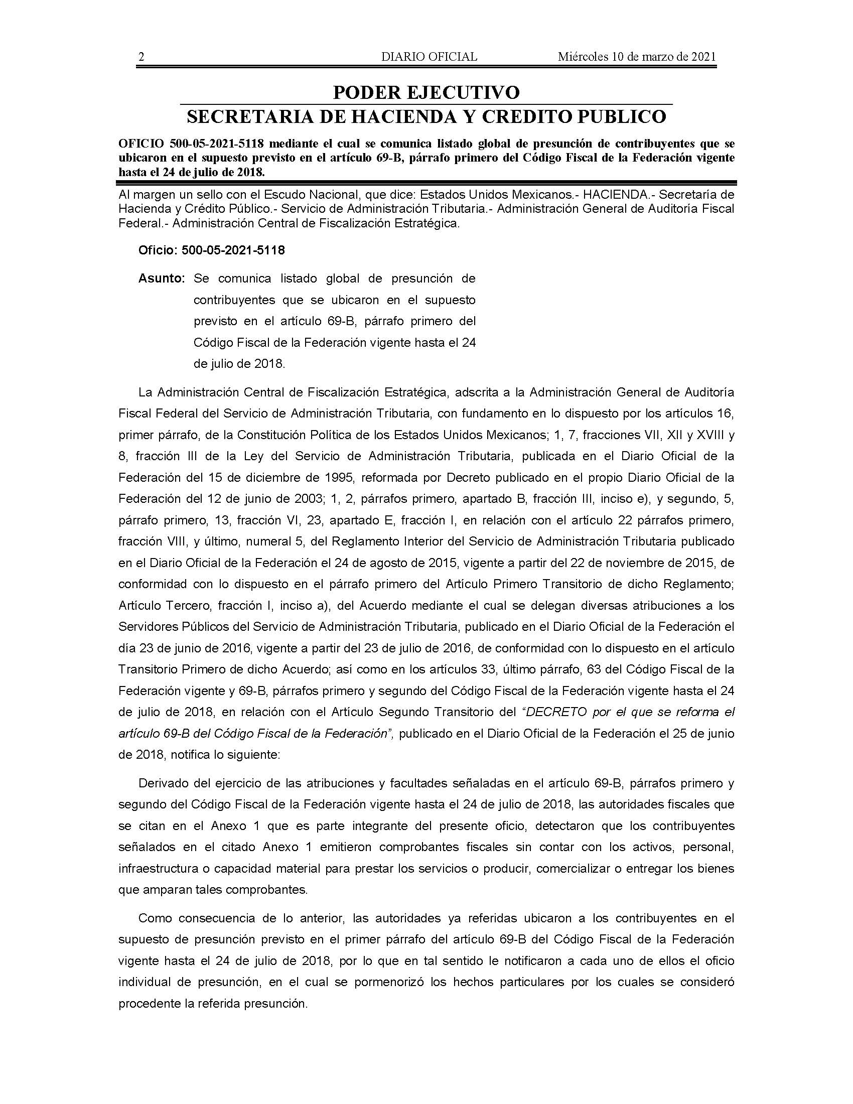 Oficio 500-05-2021-5118 mediante el cual se comunica listado global de presunción de contribuyentes que se ubicaron en el supuesto previsto en el artículo 69-B, párrafo primero del Código Fiscal de la Federación vigente hasta el 24 de julio de 2018.
