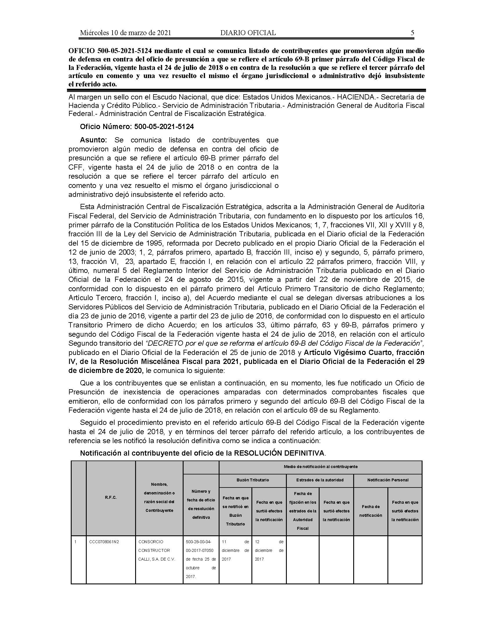 Oficio 500-05-2021-5124 mediante el cual se comunica listado de contribuyentes que promovieron algún medio de defensa en contra del oficio de presunción a que se refiere el artículo 69-B primer párrafo del Código Fiscal de la Federación, vigente hasta el 24 de julio de 2018 o en contra de la resolución a que se refiere el tercer párrafo del artículo en comento y una vez resuelto el mismo el órgano jurisdiccional o administrativo dejó insubsistente el referido acto.