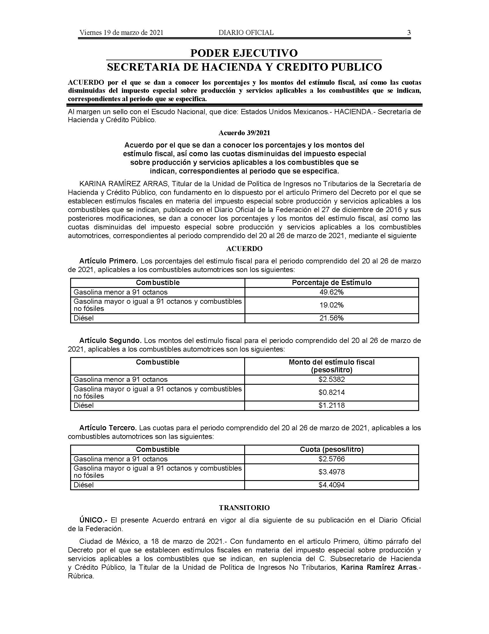 Acuerdo por el que se dan a conocer los porcentajes y los montos del estímulo fiscal, así como las cuotas disminuidas del impuesto especial sobre producción y servicios aplicables a los combustibles que se indican, correspondientes al periodo que se especifica.