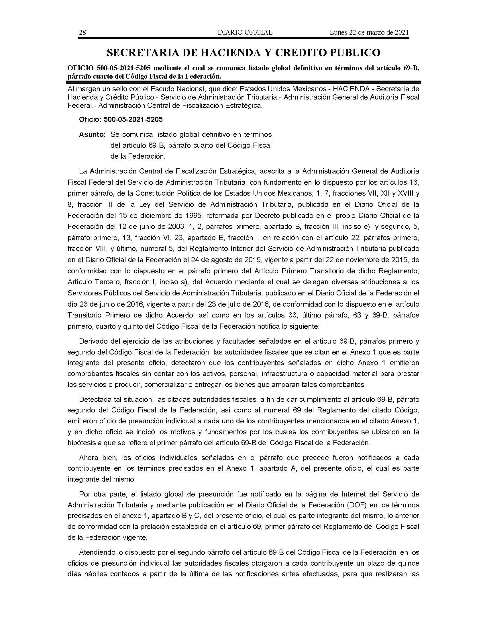 Oficio 500-05-2021-5205 mediante el cual se comunica listado global definitivo en términos del artículo 69-B, párrafo cuarto del Código Fiscal de la Federación.