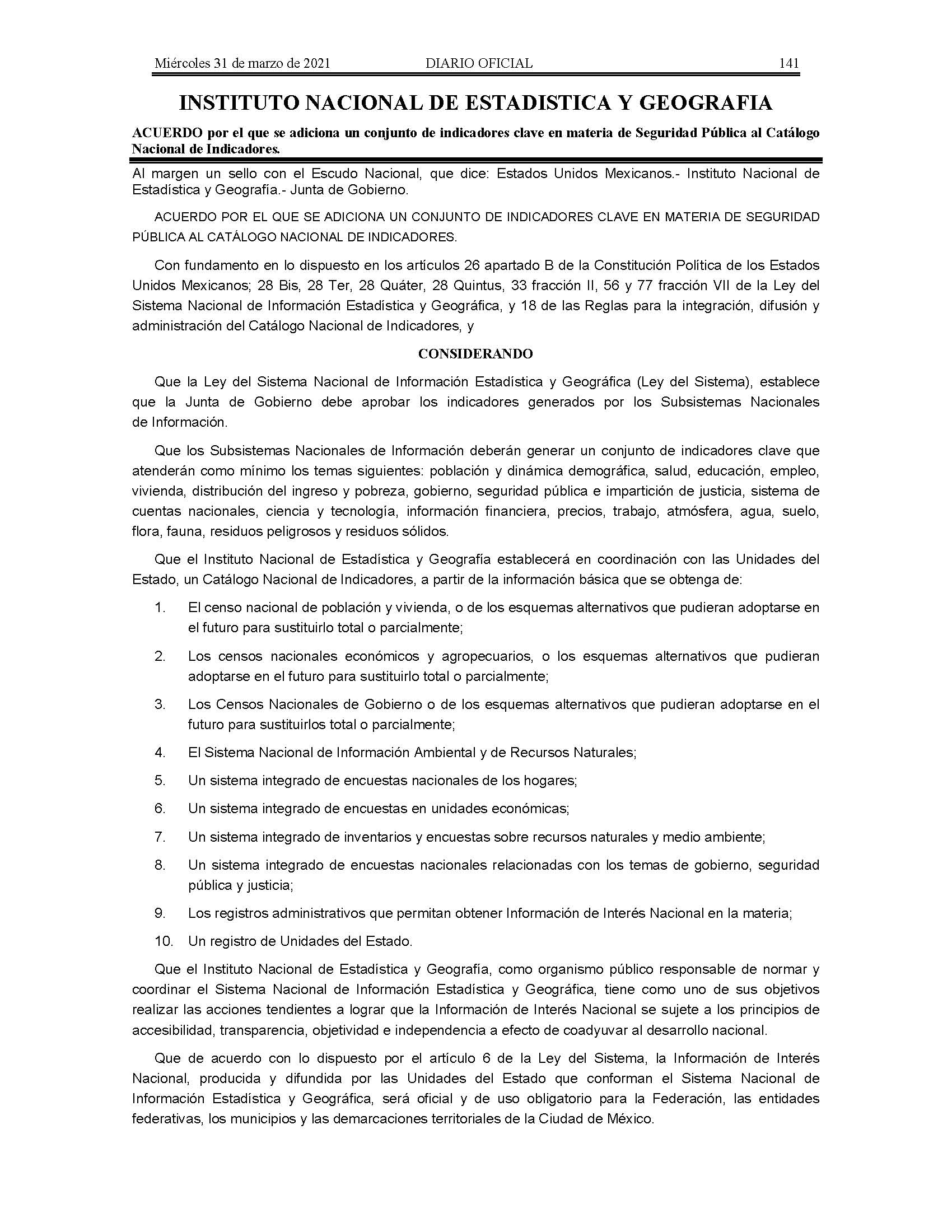 Acuerdo por el que se adiciona un conjunto de indicadores clave en materia de Seguridad Pública al Catálogo Nacional de Indicadores.