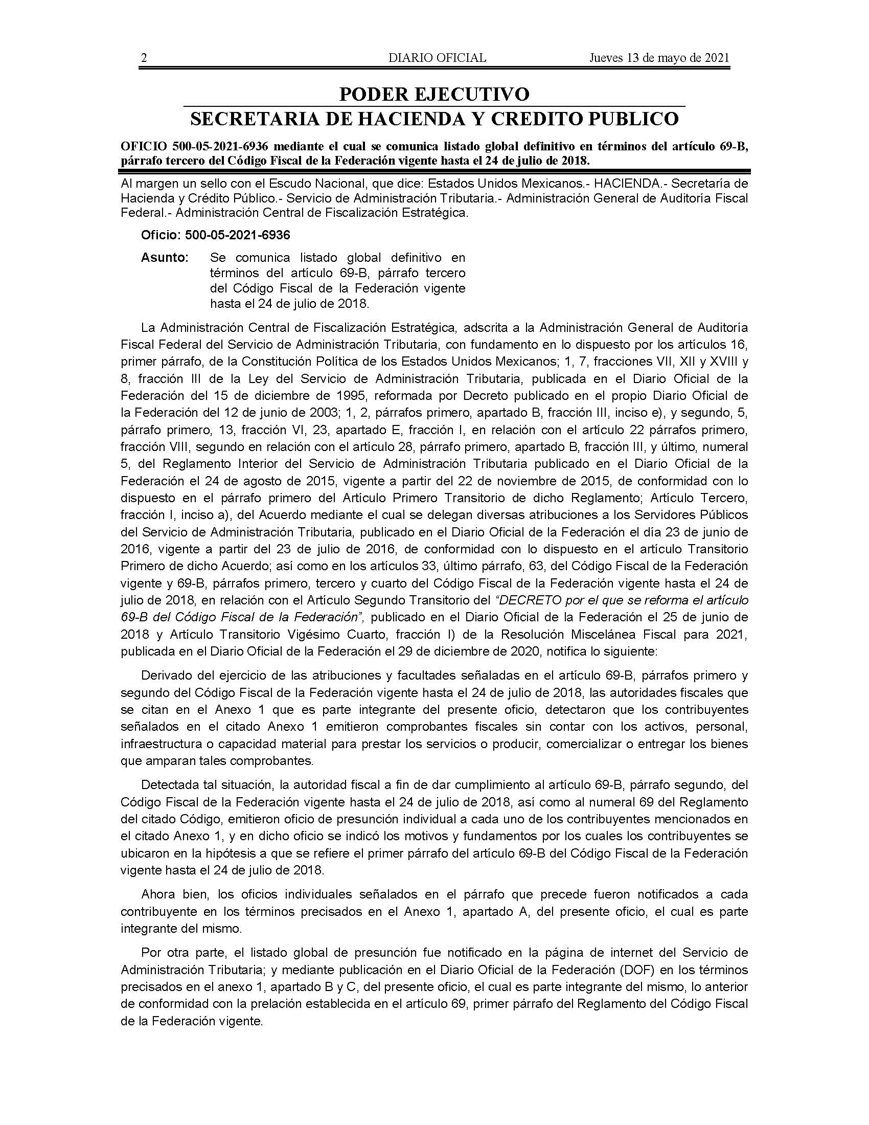 Oficio 500-05-2021-6936 mediante el cual se comunica listado global definitivo en términos del artículo 69-B, párrafo tercero del Código Fiscal de la Federación vigente hasta el 24 de julio de 2018.