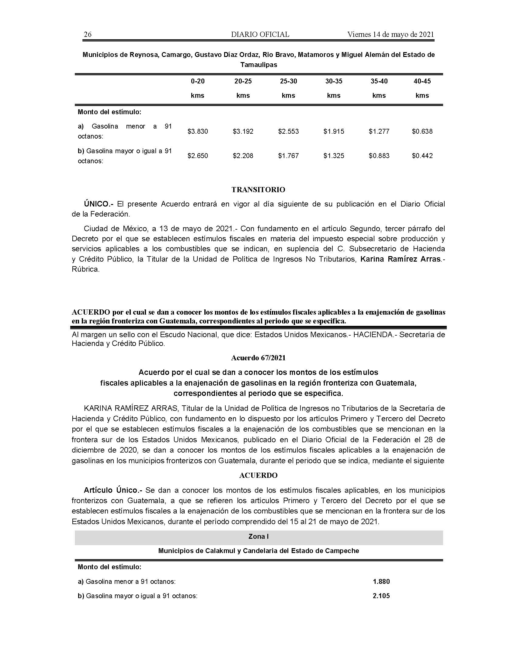 Acuerdo por el cual se dan a conocer los montos de los estímulos fiscales aplicables a la enajenación de gasolinas en la región fronteriza con Guatemala, correspondientes al periodo que se especifica.