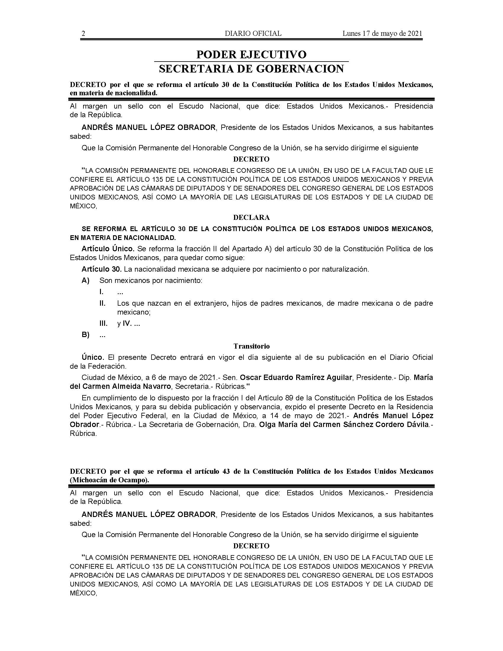 Decreto por el que se reforma el artículo 30 de la Constitución Política de los Estados Unidos Mexicanos, en materia de nacionalidad.