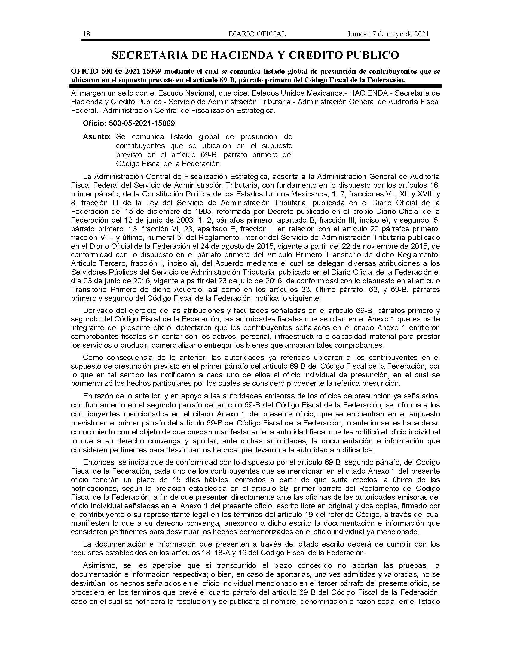 Oficio 500-05-2021-15069 mediante el cual se comunica listado global de presunción de contribuyentes que se ubicaron en el supuesto previsto en el artículo 69-B, párrafo primero del Código Fiscal de la Federación.