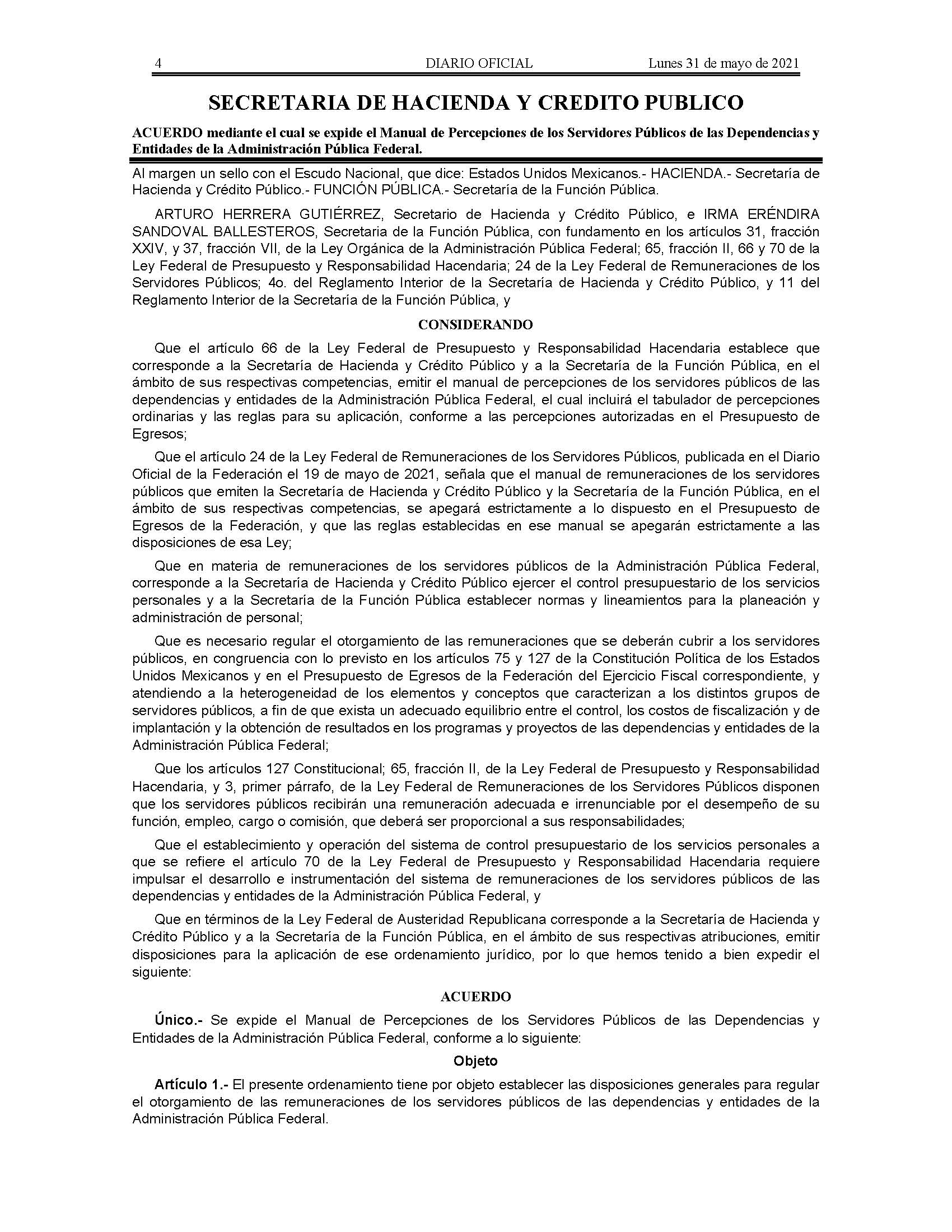 Acuerdo mediante el cual se expide el Manual de Percepciones de los Servidores Públicos de las Dependencias y Entidades de la Administración Pública Federal.
