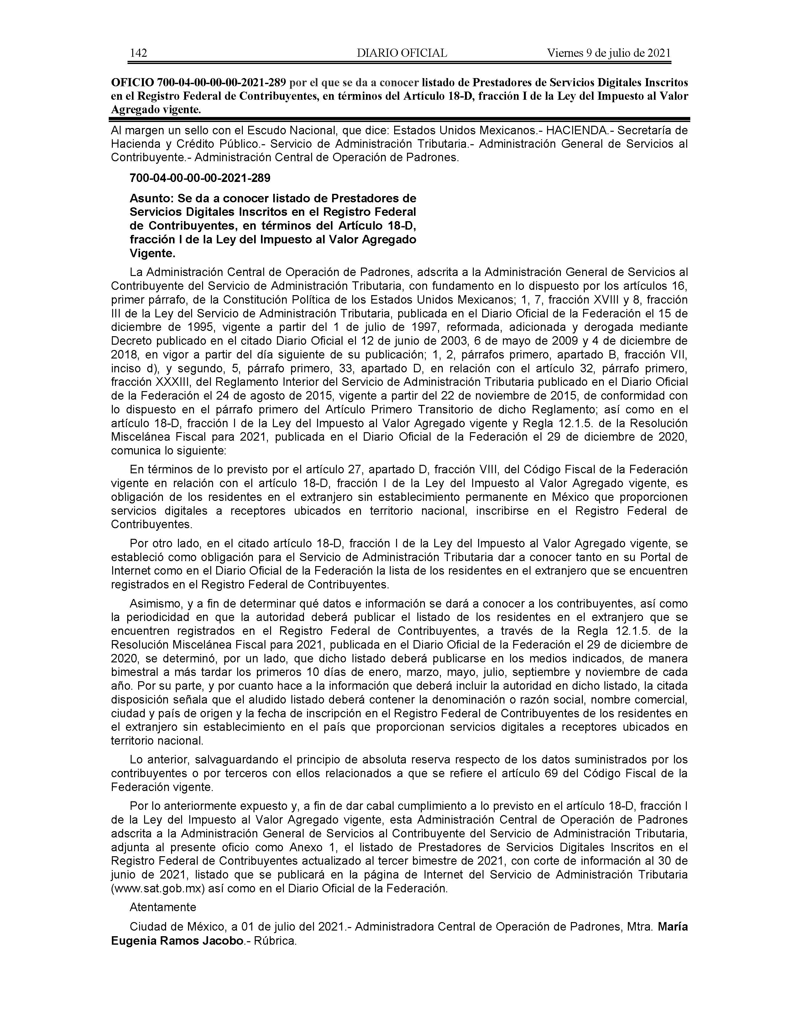 Oficio 700-04-00-00-00-2021-289 por el que se da a conocer listado de Prestadores de Servicios Digitales Inscritos en el Registro Federal de Contribuyentes, en términos del Artículo 18-D, fracción I de la Ley del Impuesto al Valor Agregado vigente.