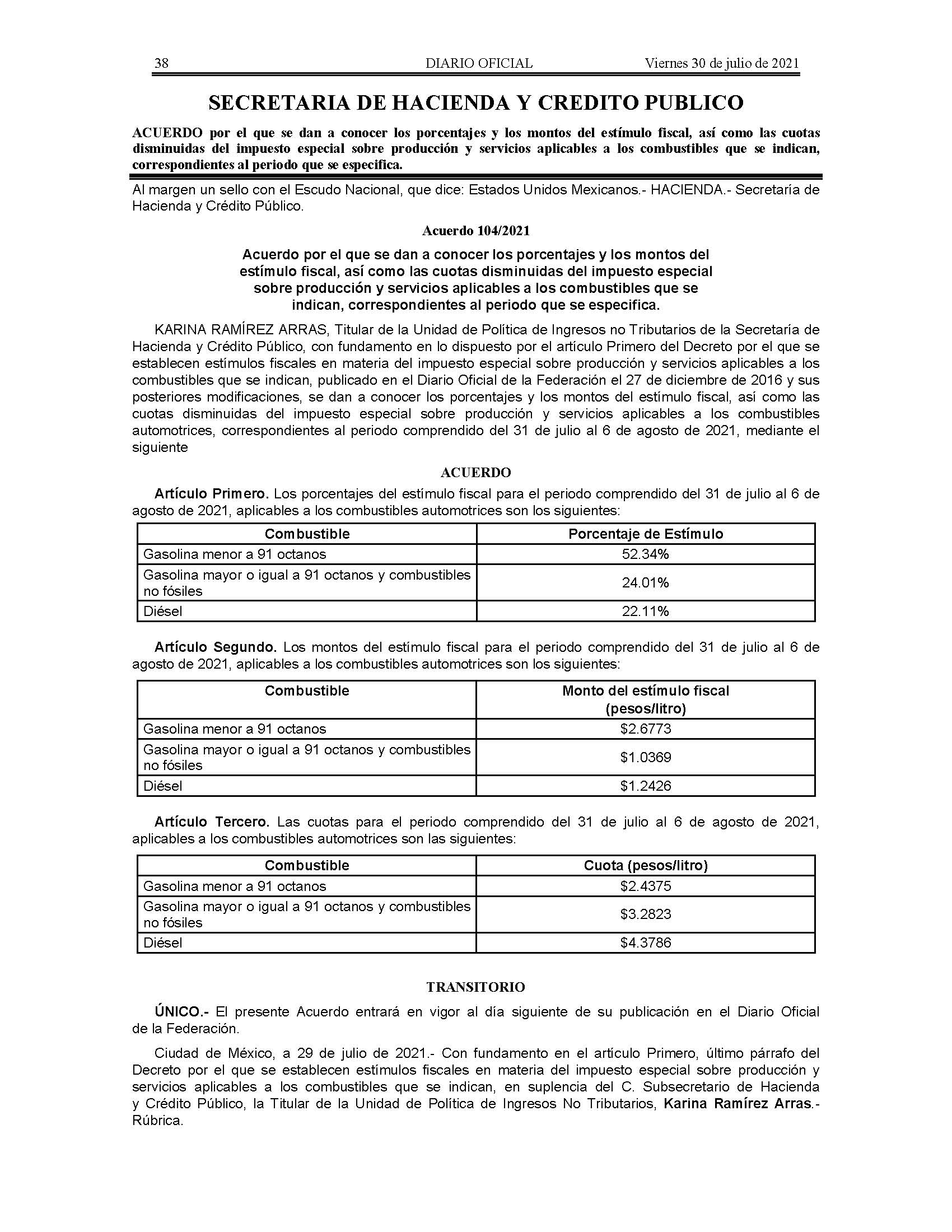 Acuerdo por el que se dan a conocer los porcentajes y los montos del estímulo fiscal, así como las cuotas disminuidas del impuesto especial sobre producción y servicios aplicables a los combustibles que se indican, correspondientes al periodo que se especifica.