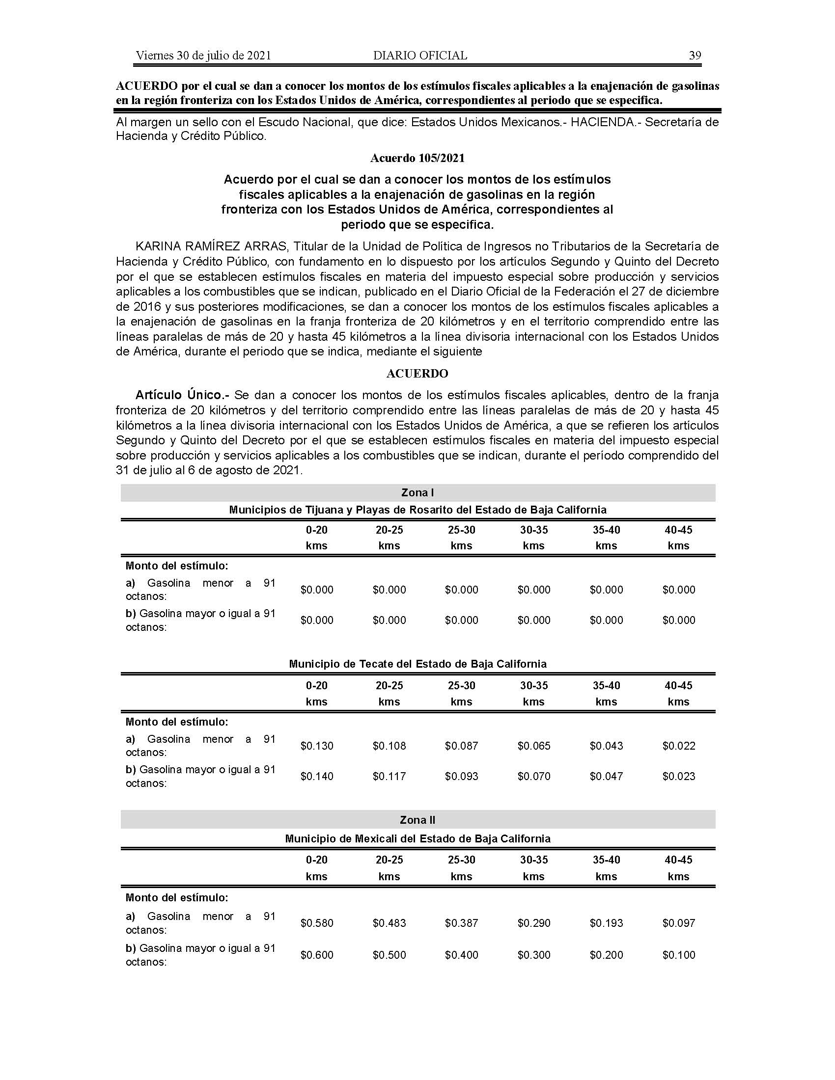 Acuerdo por el cual se dan a conocer los montos de los estímulos fiscales aplicables a la enajenación de gasolinas en la región fronteriza con los Estados Unidos de América, correspondientes al periodo que se especifica.