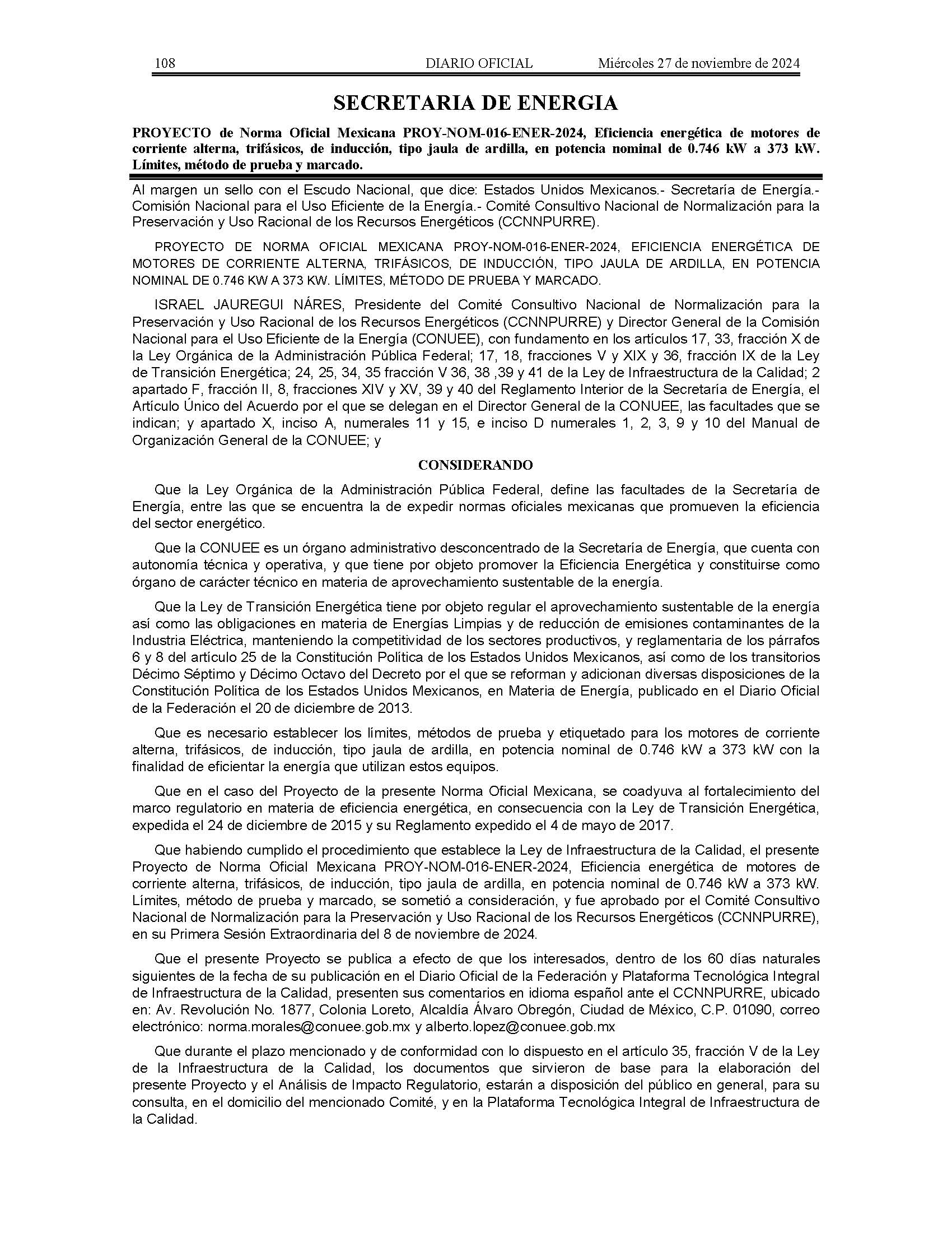 Proyecto de Norma Oficial Mexicana PROY-NOM-016-ENER-2024, Eficiencia energética de motores de corriente alterna, trifásicos, de inducción, tipo jaula de ardilla, en potencia nominal de 0.746 kW a 373 kW. Límites, método de prueba y marcado.